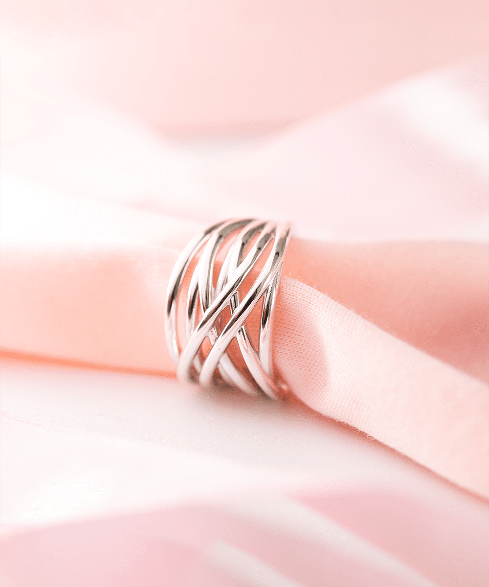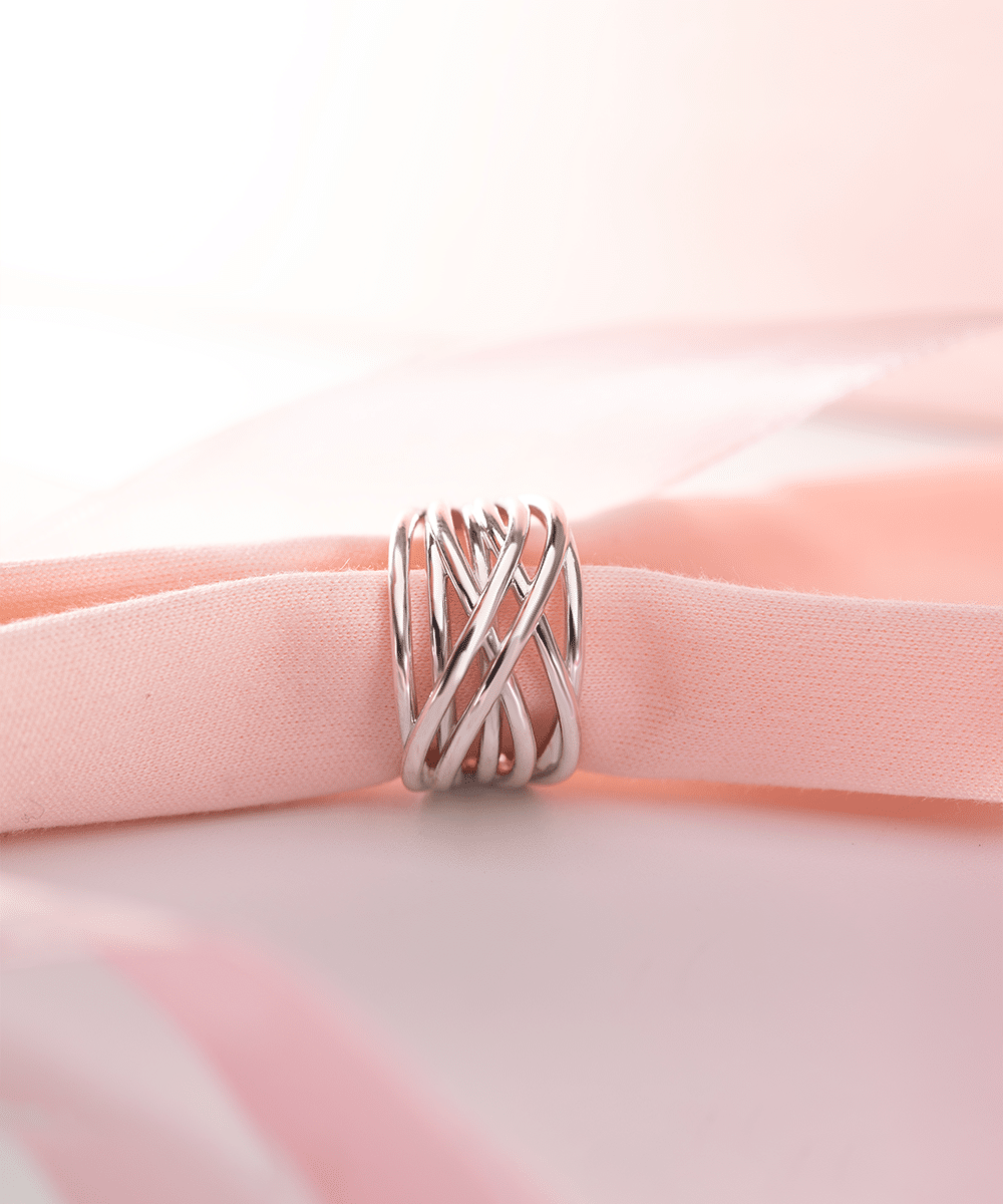 Cette bague en argent 925 séduit par son design entrelacé aux lignes fluides et légères. Son effet de plusieurs anneaux fusionnés crée un jeu de volumes subtil qui habille la main avec style.